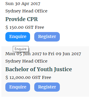 Adjusting the values in “Course List Detail View” and “Course List Summary View” it is possible to alter what content you expect to see in each course list, and the order of this content. In each case you can choose from the following: CourseCategory,Dates,Location,Venue,Format,Price,Buttons,Description.